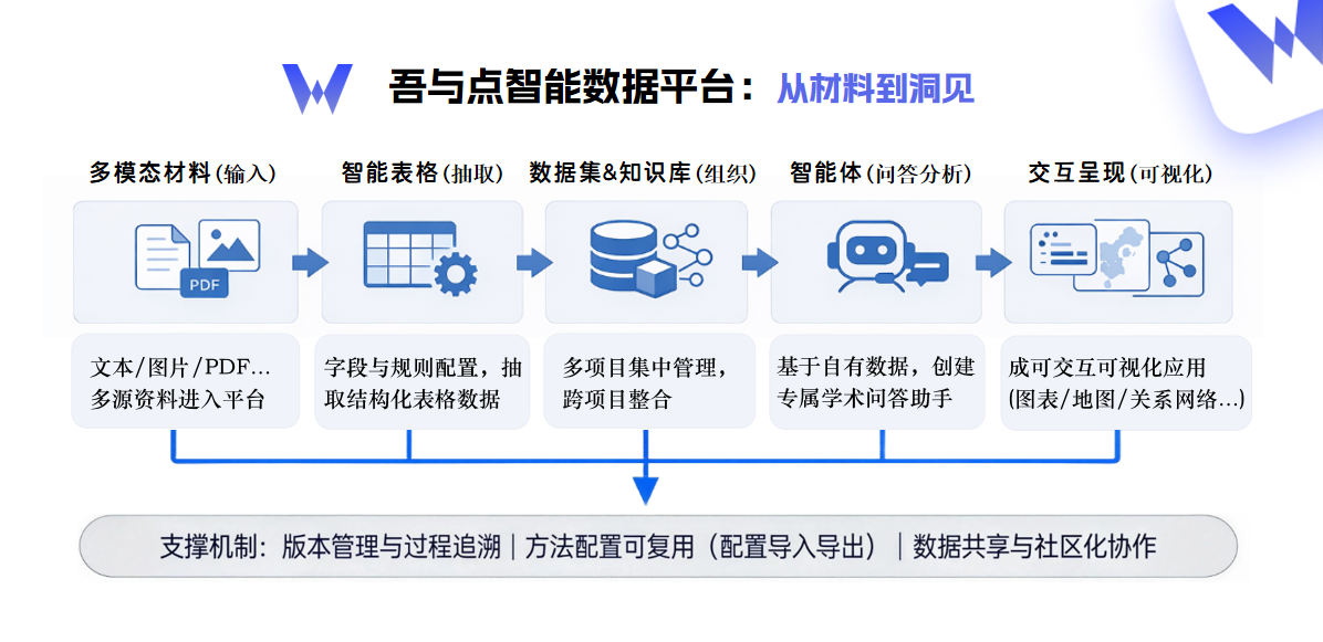 - 全流程一体化:从材料到洞见 吾与点把研究中关键环节连成一条连续流程:材料抽取 → 数据集/知识库组织 → 智能体交互 → 可视化呈现。研究者可以在同一平台内完成从资料整理到成果表达的主要工作,减少工具切换与重复劳动,使研究路径更连贯、组织更清晰。